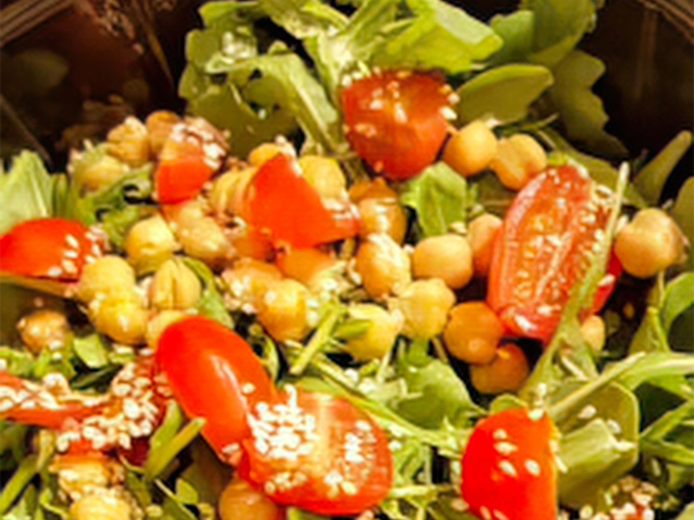 Arugula, garbanzo beans, cherry tomatoes, extra virgin olive oil, and balsamic.