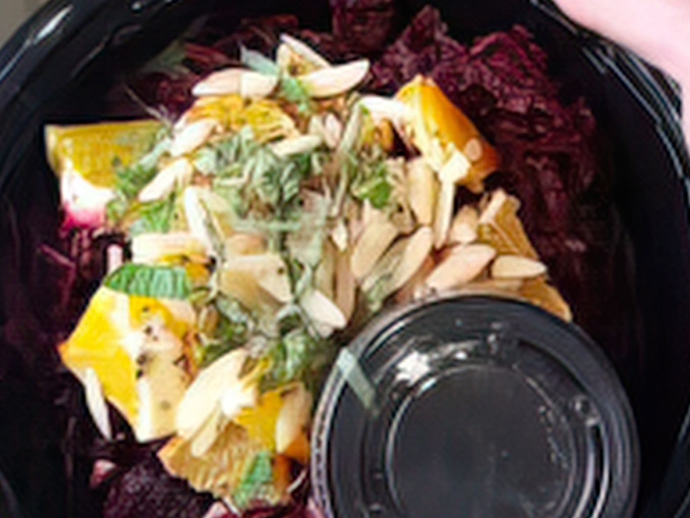 Beets, oranges, slivered almonds, extra virgin olive oil, black pepper, and a sprinkle of fresh mint.